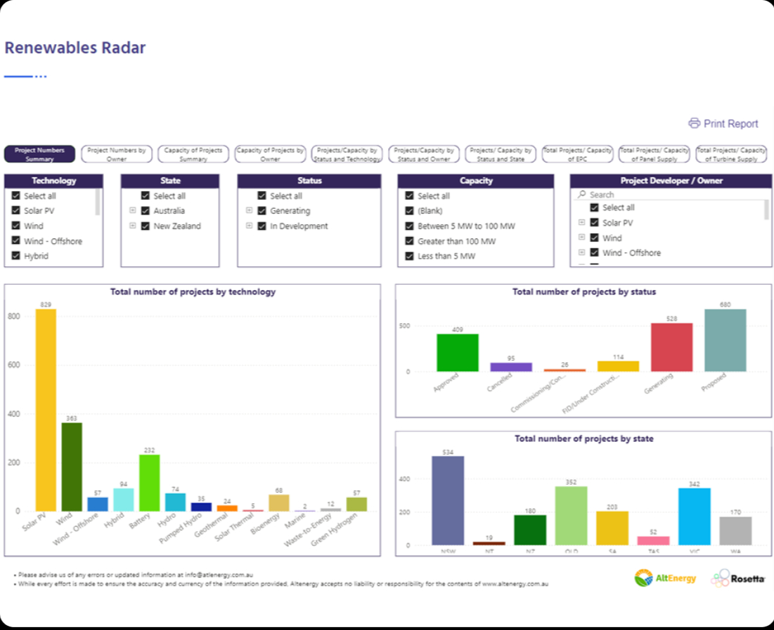 Our products track all Generating and In Development utility-scale renewable energy projects in Australia and New Zealand, provide information about who’s doing what and where in the industry, and break down industry-wide data into clear and informative packages.